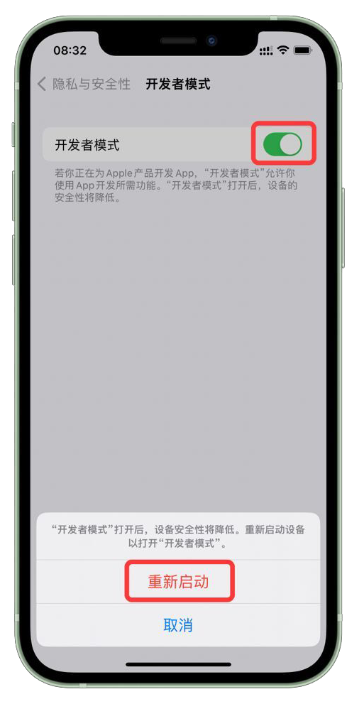然后在设备中点击【设置>>隐私与安全性>>开发者模式】,开启开发者模式,然后提示重启手机,点击重新启动